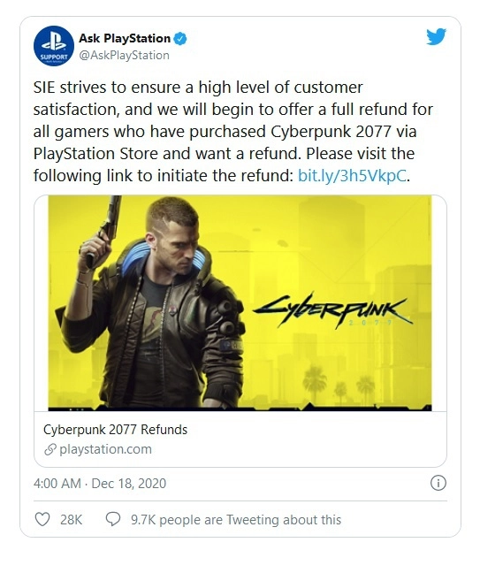 После неудачного запуска игры на консолях CD Projekt Red опубликовали заявление, в котором обещали дальнейшее улучшение производительности, а также посоветовали игрокам «использовать систему возврата средств PSN или Xbox соответственно». Проблема в том, что до сих пор система возмещения Sony работала сложнее: некоторые клиенты сообщали, что компания отклоняла их запросы, в то время как другие были успешными.
