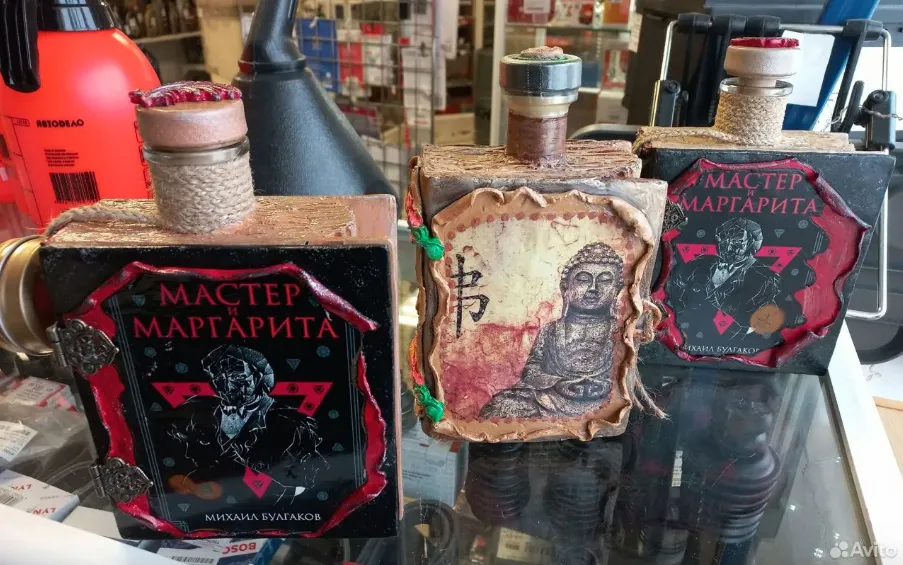 Житель Владимира своими руками делает декоративные бутылки. Ими можно украшать интерьер или пользоваться в быту. Несмотря на необычный дизайн, из такой бутылки можно пить любые напитки. Оформление может быть любым, в том числе в стиле книги «Мастер и Маргарита», как на фото. Стоимость такого экземпляра — три тысячи рублей. Это отличная идея для подарка поклоннику романа.