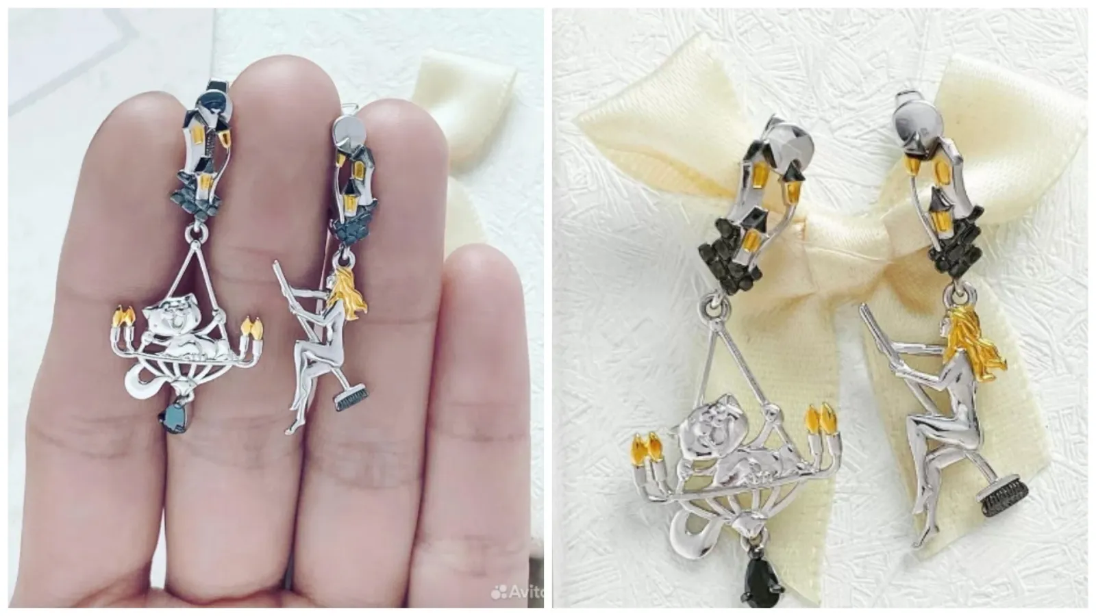 Создать оригинальный образ помогут асимметричные серьги с намеками на сцены из романа. Одна серьга изображает полет Маргариты на метле, а другая — кота Бегемота, сидящего на люстре. Украшение на английском замке изготовлено из серебра 925-й пробы, покрытие — родий и позолота. Серьги довольно крупные, но при этом легкие — всего 5,5 граммов. Стоимость комплекта — около шести тысяч рублей.