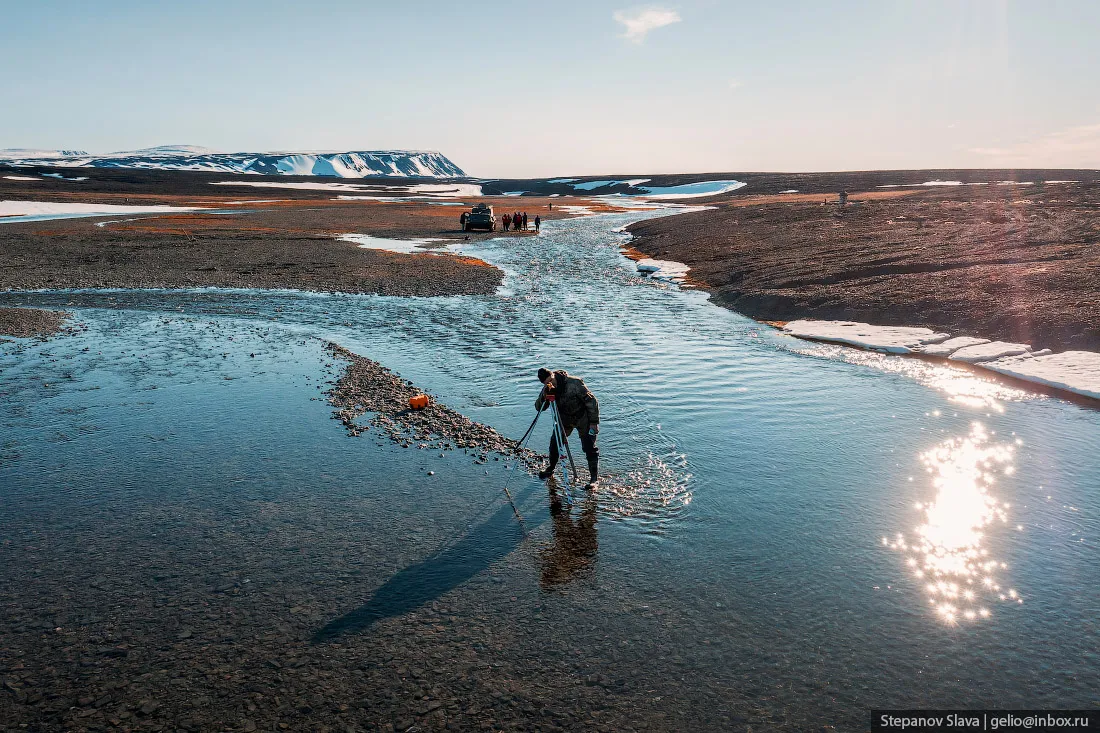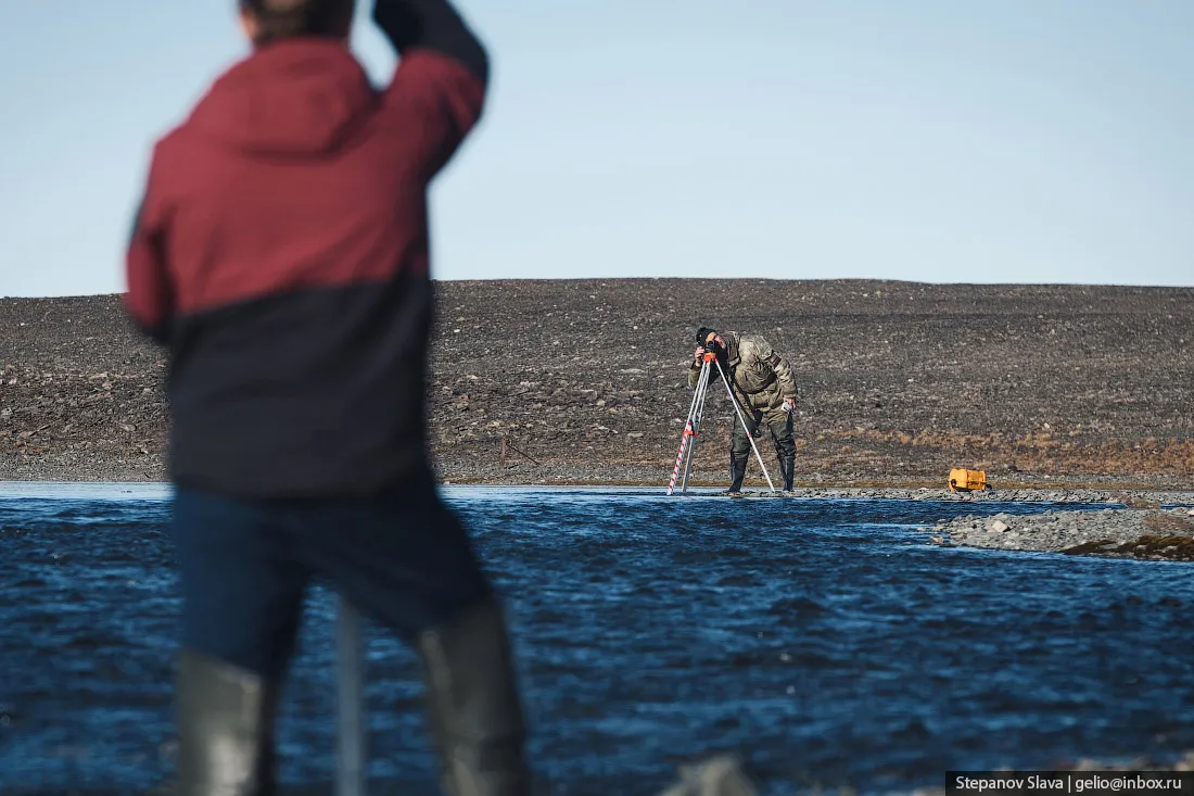 15. У каждой экспедиции своя программа, но основная цель всех исследований — изучение арктической природы в условиях меняющегося климата и глобального потепления. Здесь учёные изучают течение арктических рек, чтобы понять, какой темп таяния ледников в этом году.