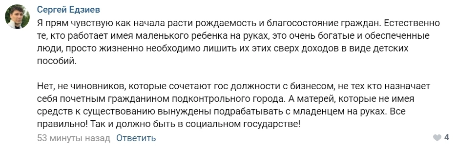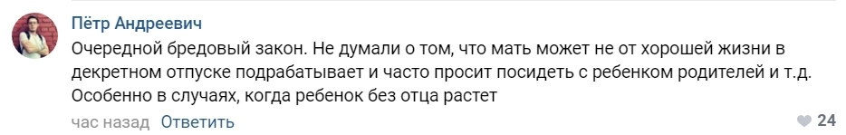 В ведомстве пояснили журналистам РБК, что таким образом хотят «бороться со злоупотреблением правом на пособие». По мнению Минтруда, если находящийся в декрете родитель проводит на подработке больше времени, чем с ребенком, то он не должен получать выплаты. При этом не уточняется, сколько именно времени следует посвящать ребенку, а сколько — подработке.