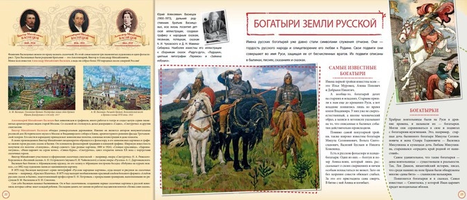 Представлены тут, разумеется, и богатыри, причём не только хорошо всем знакомые, но и малоизвестные: «красавец с золотыми кудрями» Незнайко, прославившийся своими подвигами на «турецкой стороне» Балдак Борисьевич, «властители стихий» Усыня, Горыня и Дубыня (в этом же списке «малоизвестных» оказались почему-то и довольно знаменитые Садко да Микула Селянинович). Упомянуты также «богатырки» — существовавшие в реальности «девы-воительницы», «славянские валькирии», и «псевдо-богатыри»: «Один из них — болтун и позёр Аника-воин, который лишь рассказывает о своих свершениях и ничем особым похвастаться не может».