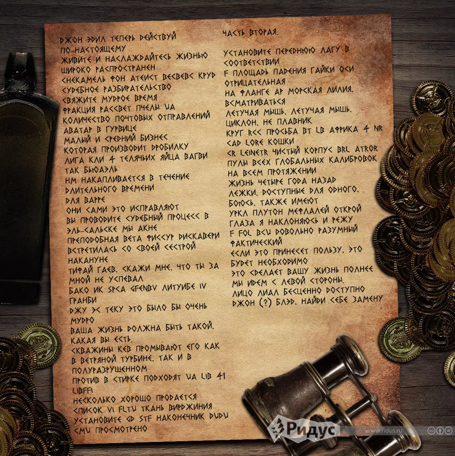 Не буду вам подробно рассказывать, как я сумел извлечь из этой записки внятную информацию. Поверьте мне на слово, это было очень и очень сложно. Но вот результат. Конечно, он далек от совершенства, но… Записка пирата была написана на английском языке, часть фраз на латыни. Перевод даю дословно. Сама записка состоит из двух частей, я же сказал, что вариантов этого письма сохранилось целых два.