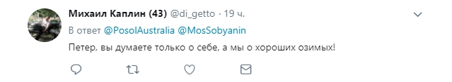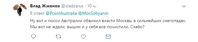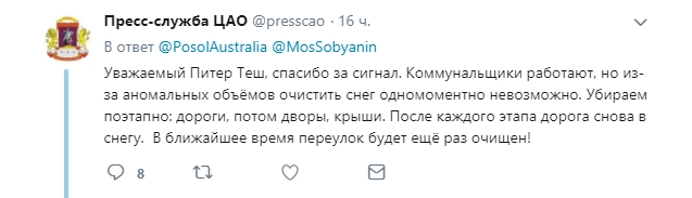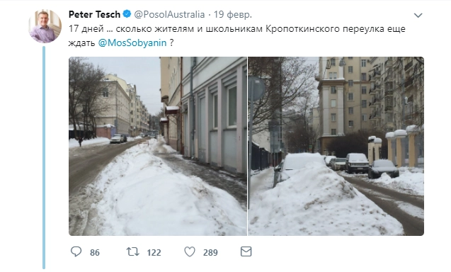 Посол Австралии Питер Теш пожаловался в Twitter на сугробы в Кропоткинском переулке. По его словам, дорогу не чистили больше двух недель.