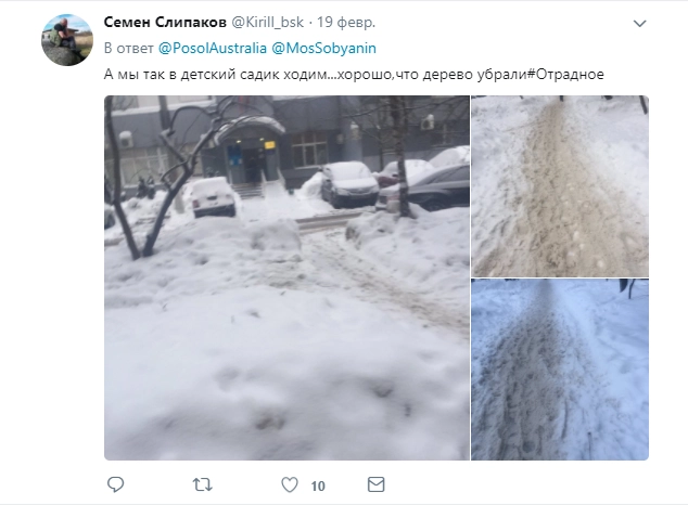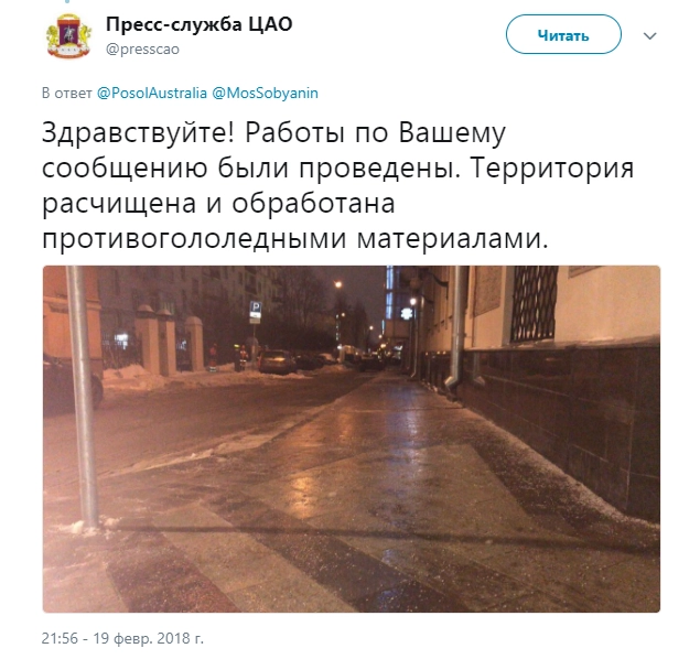 Твит был опубликован около 9 утра 19 февраля. Днем мэрия Москвы поблагодарила посла за сигнал.