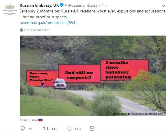 К посту они прикрепили картинку с кадром из фильма, на котором изображены три билборда. Измененный текст на плакатах гласит: «Два месяца прошло с отравления в Солсбери», «И все еще нет подозреваемых?», «Как же так, премьер-министр Мэй?».