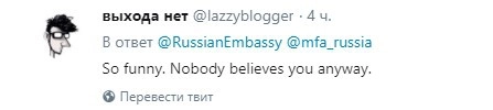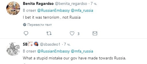 «Бьюсь об заклад, это был терроризм, а не Россия»,«Какая глупая ошибка, которую совершило наше правительство в отношении России», «Настолько смешно. Никто вам не верит», — написали они.