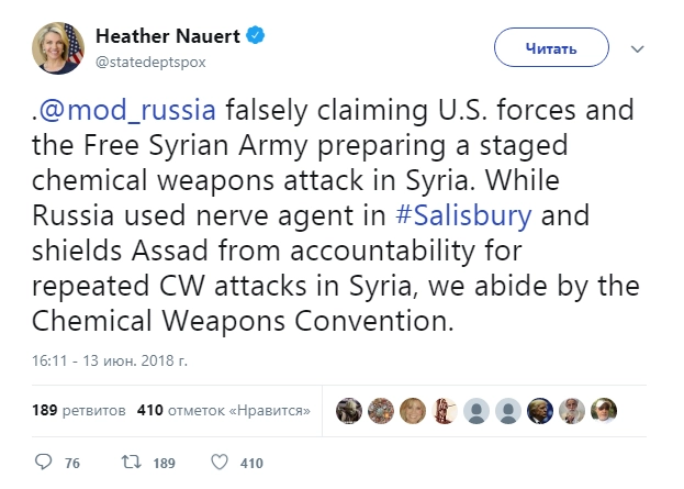 «Россия ложно обвиняет американские войска и Свободную армию Сирии в подготовке химических атак в Сирии. В то время как РФ использует нервно-паралитический газ в Солсбери и покрывает Асада от ответственности за химатаки, мы соблюдаем Конвенцию о запрещении химоружия», — написала она.
