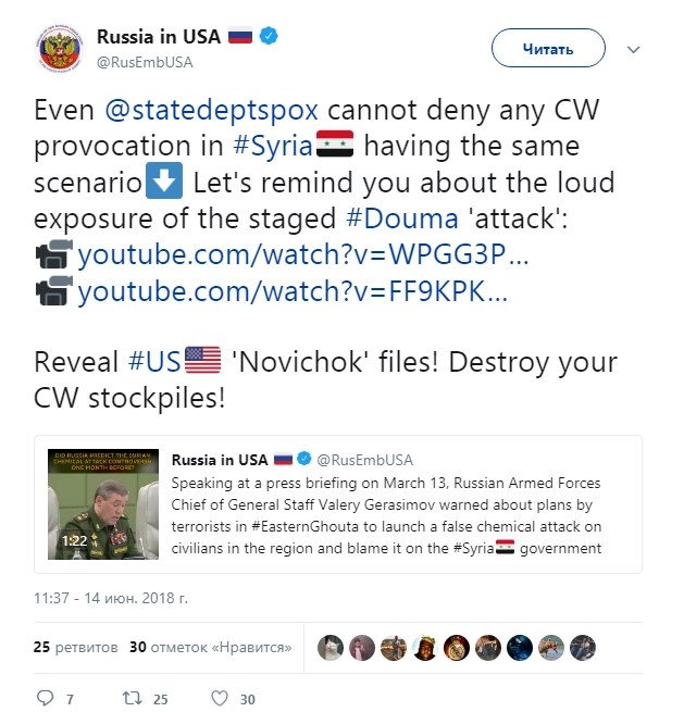 «Даже Госдепартамент не может отрицать, что провокации с использованием химического оружия в Сирии осуществляются по одному и тому же сценарию. Позвольте напомнить о громком разоблачении инсценированной химической атаки в Думе», — сказано в заявлении дипломатического представительства РФ, опубликованном в Twitter.