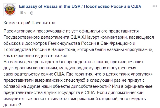 Второго сентября в помещениях прошли обыски. Глава МИД Сергей Лавров назвал это грубейшим нарушением международного права и добавил, что Москва готова обратиться в суд. Представитель Госдепартамента утверждал, что обыски велись уже после закрытия объектов и не противоречили закону.