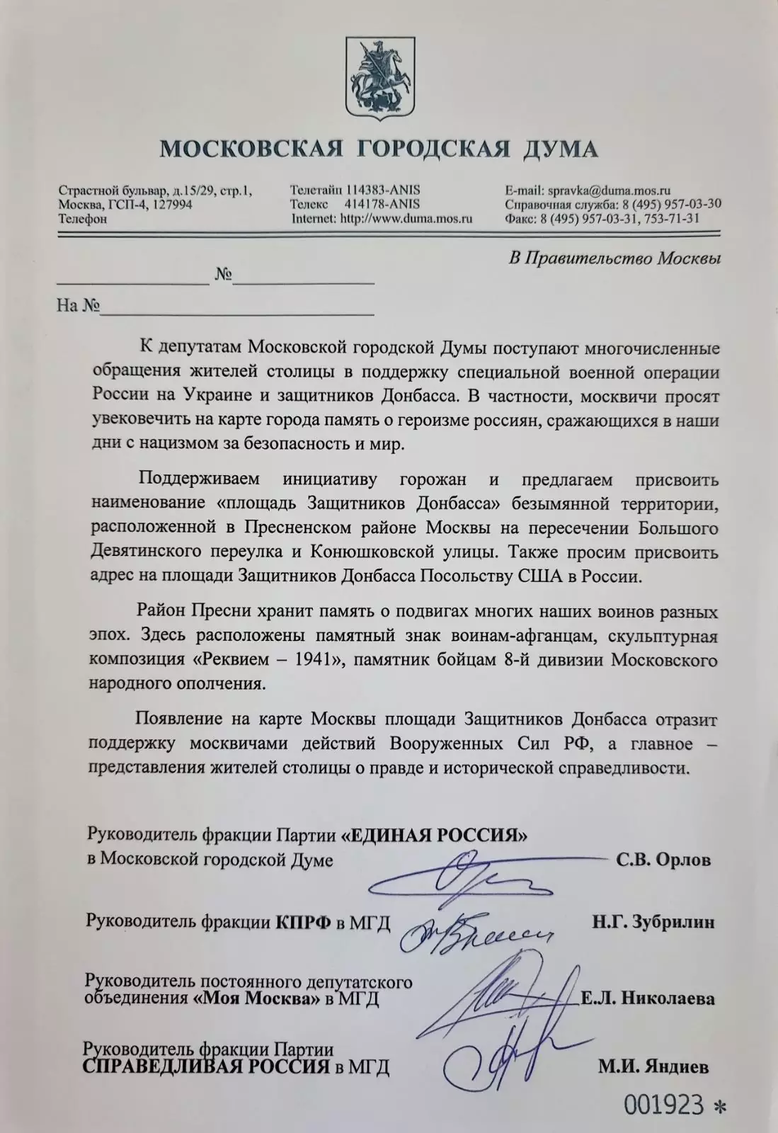 Появление такой площади на карте Москвы отразит «безусловную поддержку жителями столицы действий Вооруженных сил России на Украине, а главное — представления москвичей об исторической справедливости», считает руководитель фракции «Единой России» в МГД Степан Орлов.