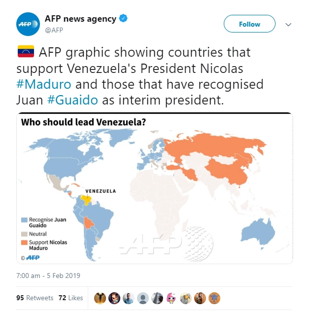 Причиной для недовольства послужила распространенная накануне инфографика, на которой были отмечены страны, поддерживающие действующего президента Венесуэлы Николаса Мадура и его политического оппонента Хуана Гуаидо.