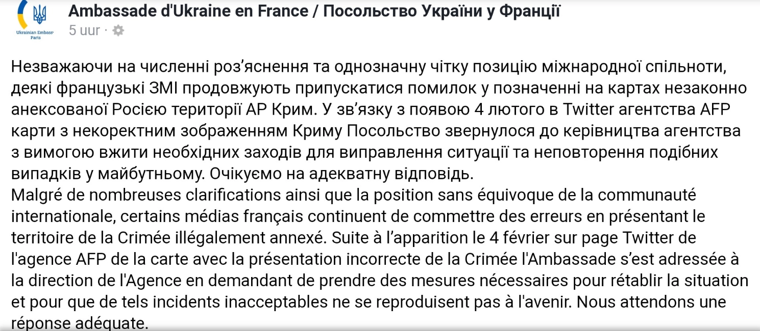 Несмотря на многочисленные разъяснения и однозначную четкую позицию международного сообщества, некоторые французские СМИ продолжают допускать ошибки в обозначении на картах. В связи с появлением 4 февраля в Twitter агентства AFP карты с некорректным изображением Крыма, посольство обратилось к руководству агентства с требованием принять необходимые меры для исправления ситуации и неповторения подобных случаев в будущем. Ожидаем адекватный ответ, — говорится в интернет-обращении.