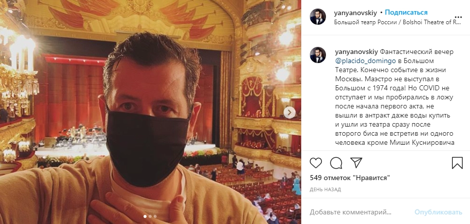 Изначально в своем посте Яновский рассказал о том, как ходил в Большой Театр, но при этом все время находился в маске. Бизнесмен негодовал, что почти все зрители театра не соблюдали перчаточно-масочный режим и именно в этот момент в комментарии ворвалась Андреева. Ведущая новостей призналась, что тоже была в театре, маску не надевала, поскольку не хочет получить энфизему легких, а также привела статистику по смертности в России и США.