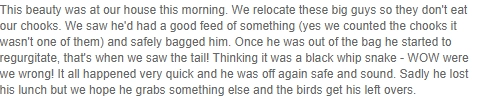 «Этот красавец появился утром у нашего дома. Мы оттащили верзилу подальше, чтобы он не съел наших кур. Обнаружив, что питон уже наелся, мы осторожно засунули его в мешок».