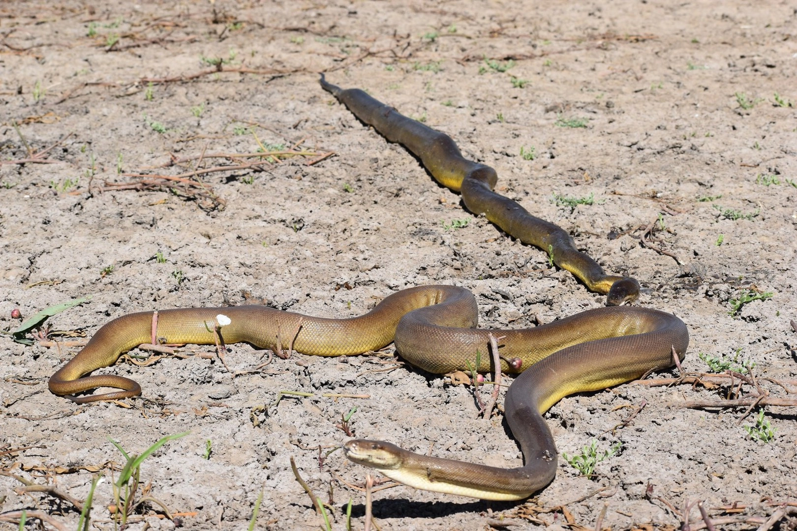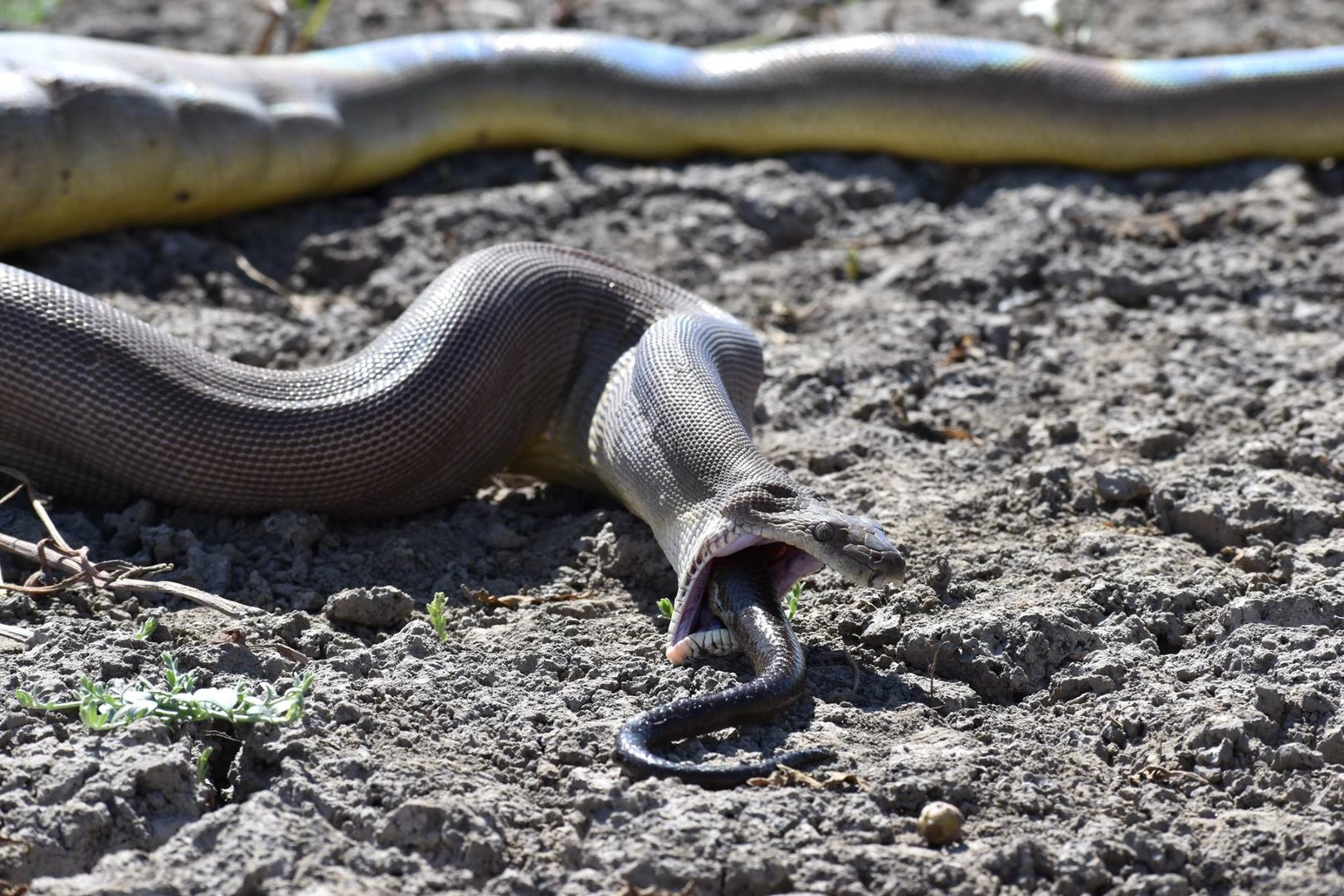 Австралийский оливковый питон поразил пользователей Сети, выплюнув проглоченную змею другого вида, не уступающую в размере ему самому.