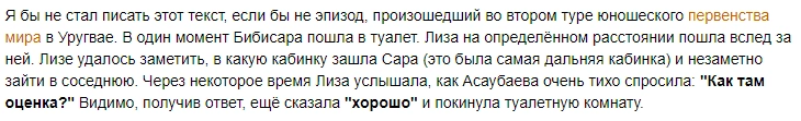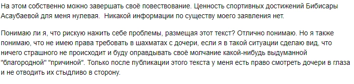 «„Вот откуда такая самоуверенная прекрасная и взрослая игра! — начали кричать недруги Асаубаевой. — Это не она играет. Это компьютер! Ей подсказывают! Она — заурядный игрок!“ Излишне говорить, что устроители чемпионата мира никаких нарушений не обнаружили. Пронести что-либо металлическое на турнир просто не реально. Однако несчастного ребенка перед игрой стали тщательно обыскивать. В такой ситуации нервный срыв и истерики могут произойти с любым из нас, не говоря уже о ребенке», — написал в Facebook Добровинский.