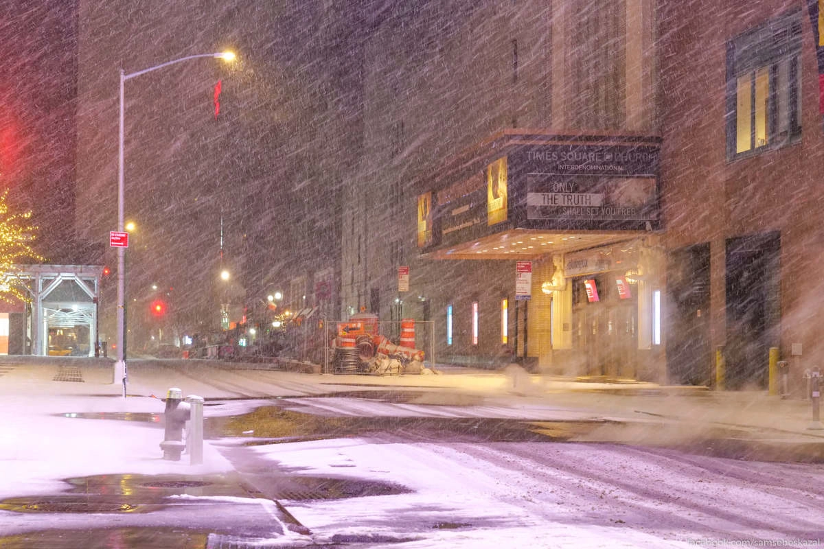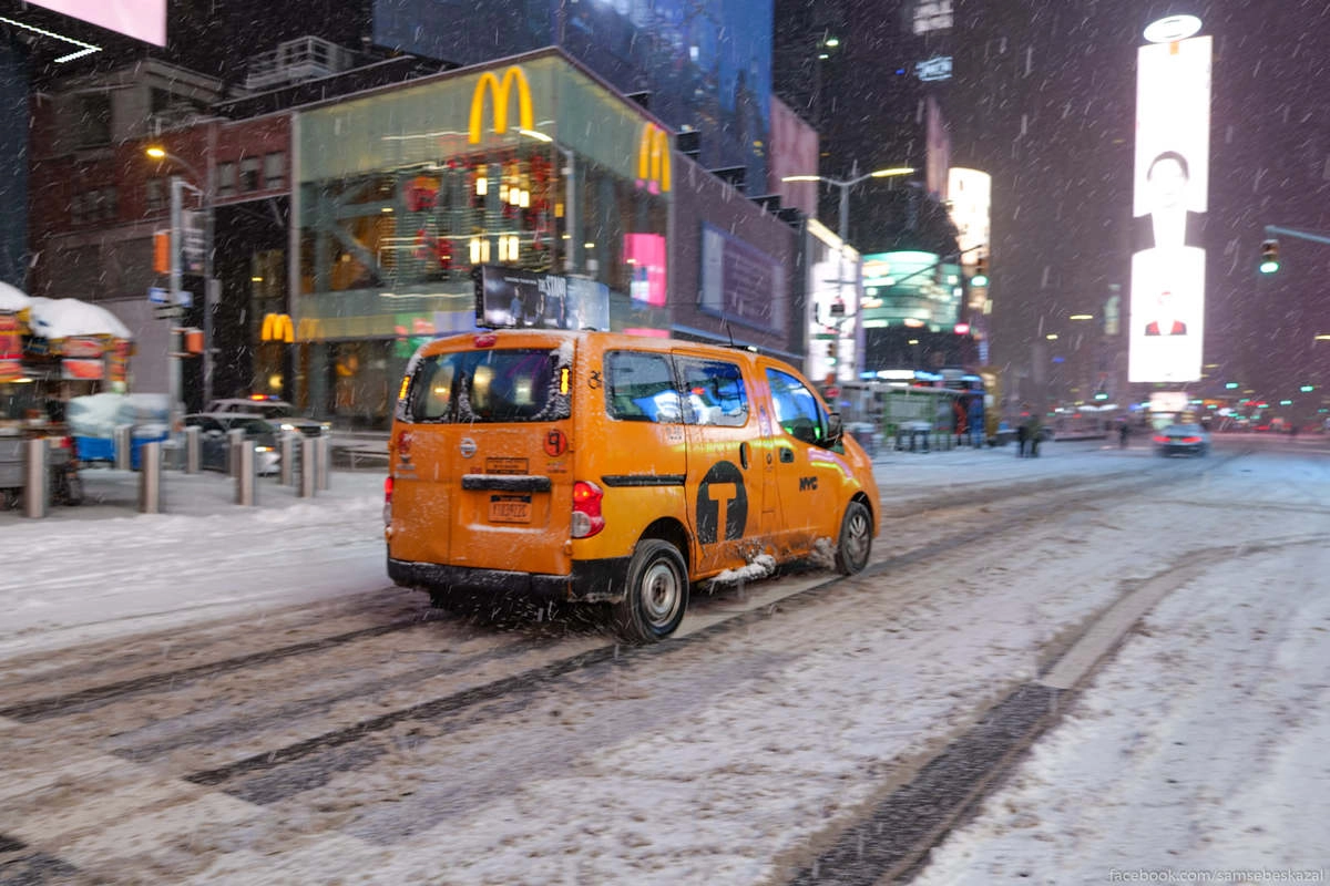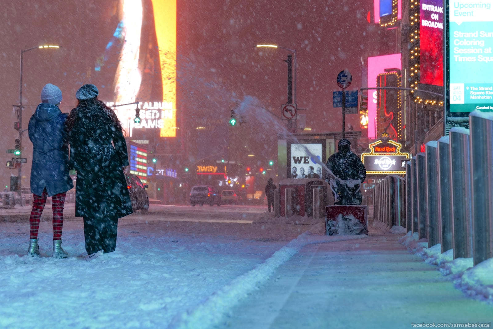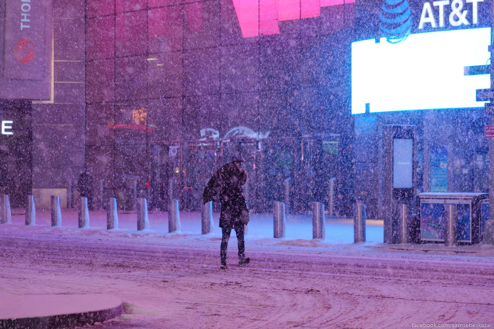 Все едут в снегопад на Таймс-сквер, но это, наверное, самое убираемое в городе место. Картинки с занесенными снегом улицами точно надо снимать не там.