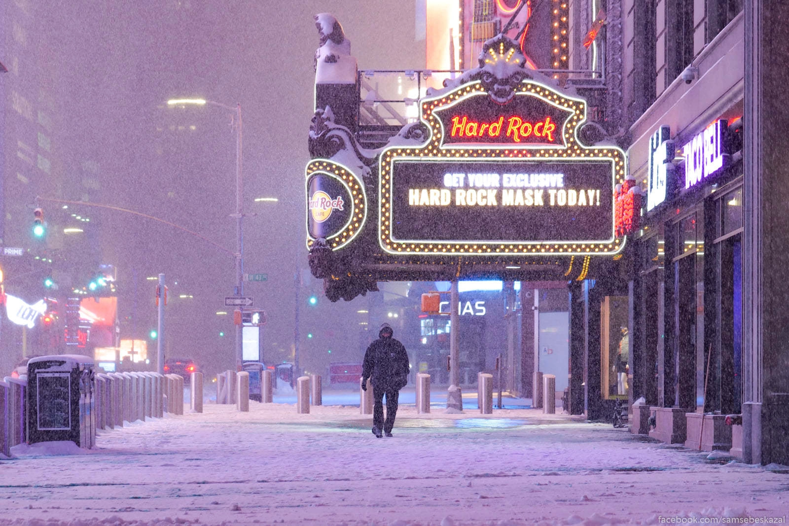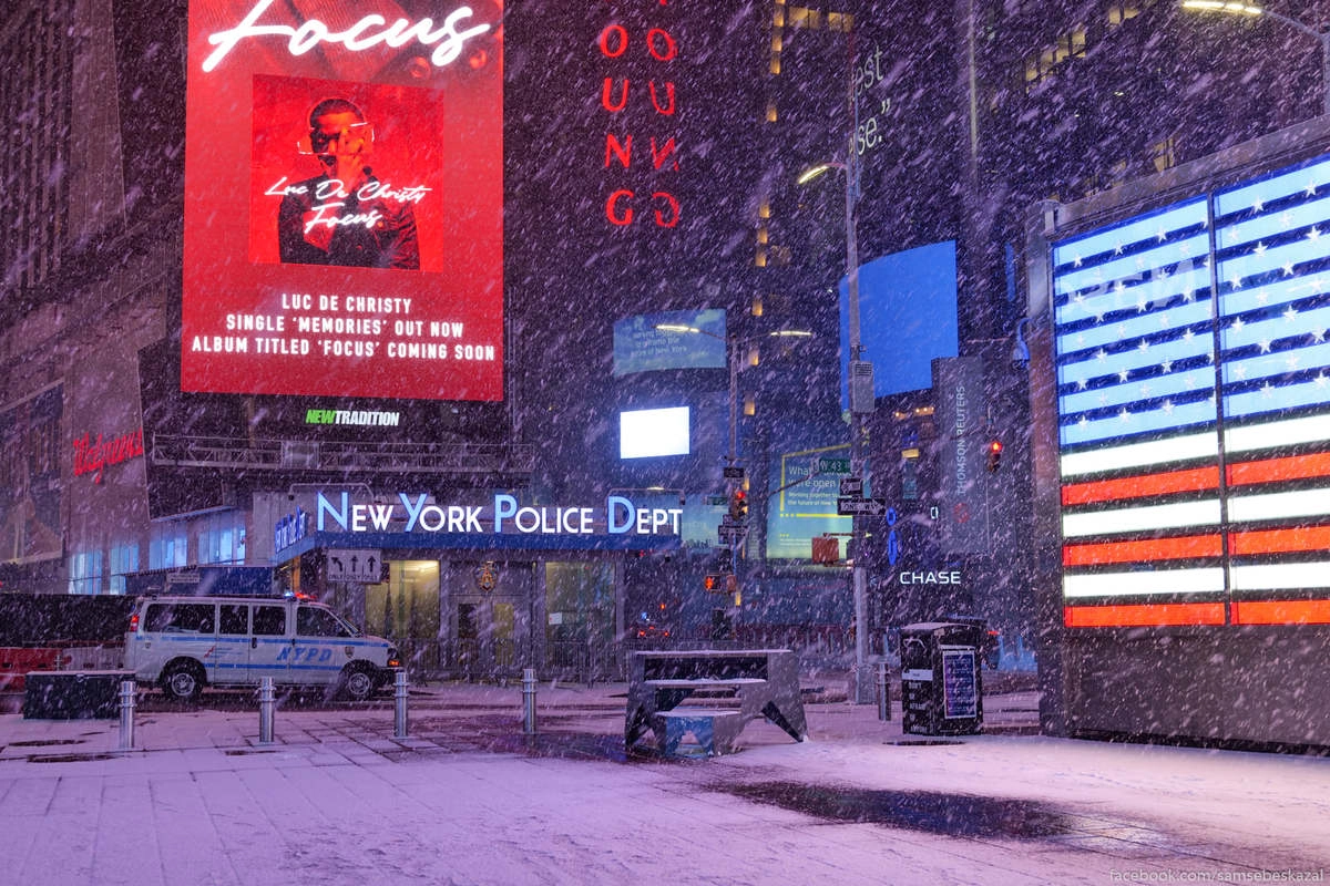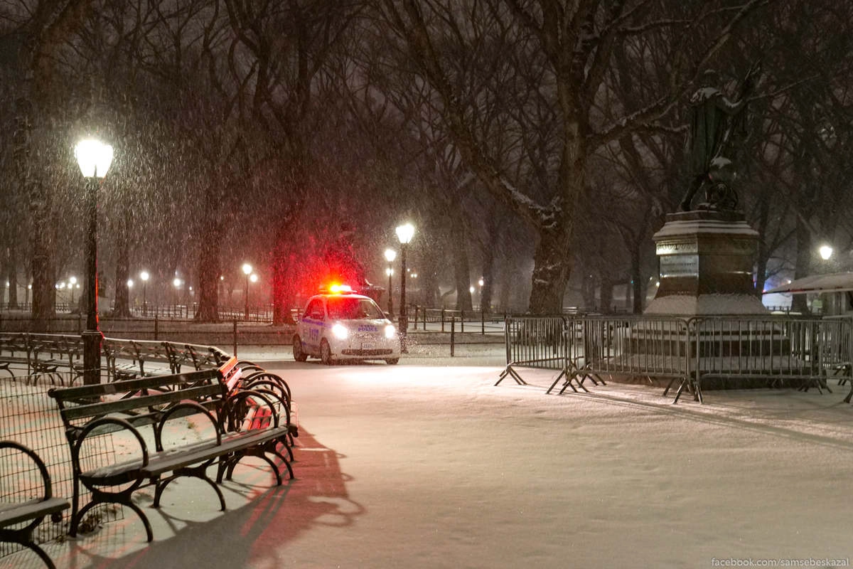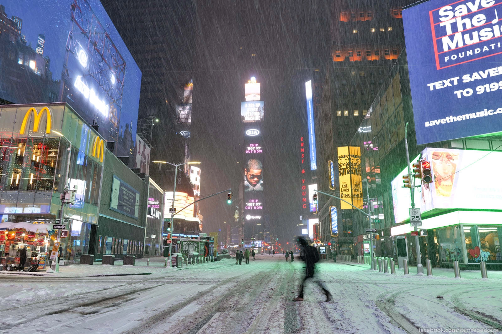 Все едут в снегопад на Таймс-сквер, но это, наверное, самое убираемое в городе место. Картинки с занесенными снегом улицами точно надо снимать не там.