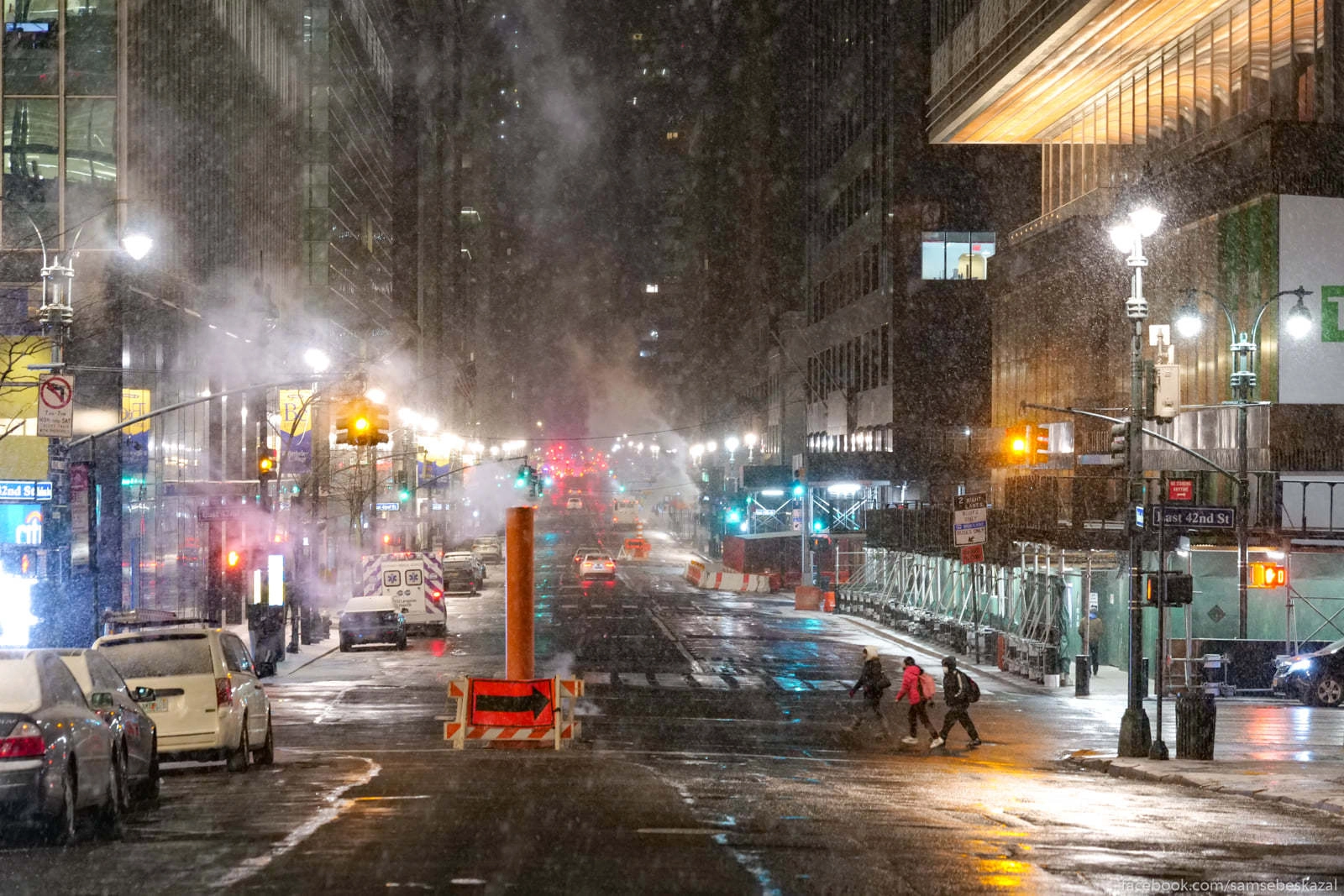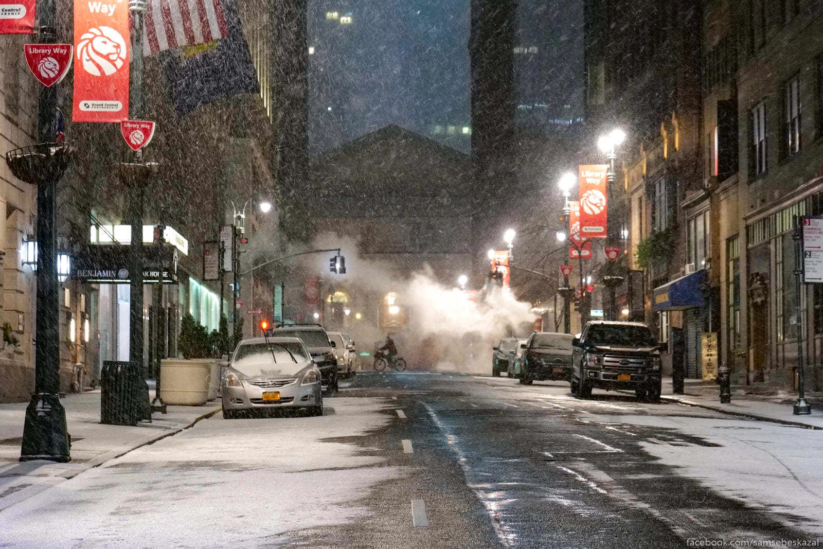 Четыре составляющих успеха: Манхэттен, ночь, снег и пар.
