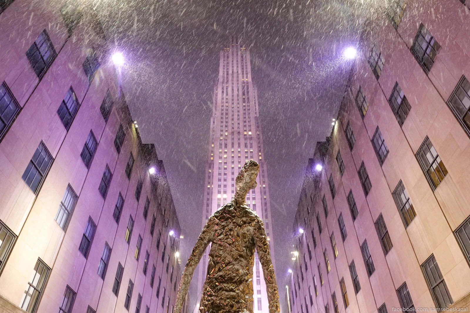 Алюминиевый человек с удивлением смотрит на падающий у Рокфеллер-центра снег .