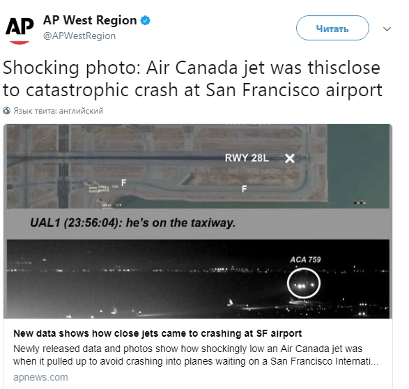 Эксперты назвали причину инцидента, произошедшего в аэропорту Сан-Франциско 8 июля. Гигантский самолет А320 авиакомпании Air Canada едва не врезался в воздушные суда, ожидающие своего взлета. Пилоты авиалайнера, который летел из Торонто, потеряли ориентацию и стали приземляться на рулежную полосу вместо взлетно-посадочной.
