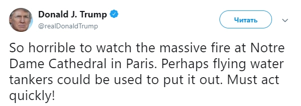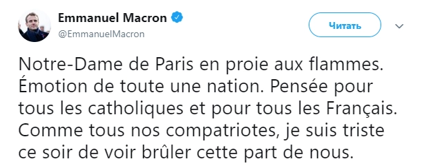 На место происшествия в ближайшее время отправится президент Франции Эмманюэль Макрон. «Как все наши соотечественники, я испытываю чувство большой грусти, когда вижу, как эта часть нас горит», — написал он в Twitter.