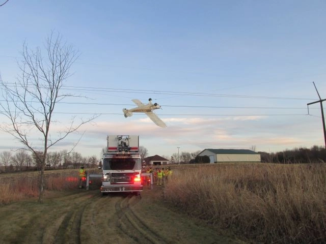 23 ноября полиция округа Скотт в штате Миннесота получила сообщение, что в районе городка Шакопи легкомоторный самолет застрял в высоковольтных проводах, перевернувшись кверху шасси. В район аварии срочно прибыли представители всех окрестных экстренных служб.