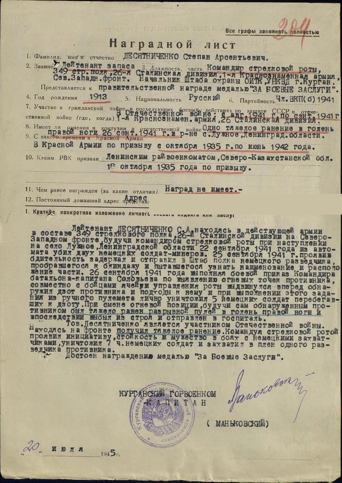 «Лейтенант Десятниченко, находясь в действующей армии <…> на Северо-Западном фронте, будучи командиром стрелковой роты при наступлении <…> 22 сентября 1941 года из автомата убил двух немецких солдат-минеров. 25 сентября 1941 года проявил бдительность, задержал и отправил в Штаб полка немецкого разведчика <…>. 26 сентября 1941 года, выполняя боевой приказ, <…> обнаружил дзот противника и подходы к нему, и <…> из ручного пулемета лично уничтожил пять немецких солдат, перебегавших к дзоту. При смене огневой позиции <…> был тяжело ранен <…> и отправлен в госпиталь», — сказано в наградном листе Степана Десятниченко, который доступен на сайте «Подвиг народа».