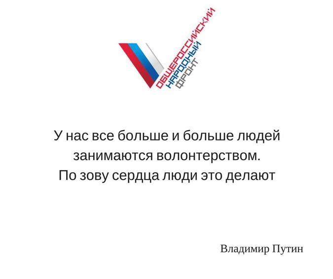 «У нас все больше и больше людей занимаются волонтерством. Примерно 7% населения РФ участвуют в добровольческом движении, а где-то 15%. Необходимо обратить на этих людей внимание, поддержать их. Я дам правительству поручение подумать об учреждении Дня волонтера. Тем более, никаких дополнительных финансовых вливаний это не потребует», — высказался Путин.