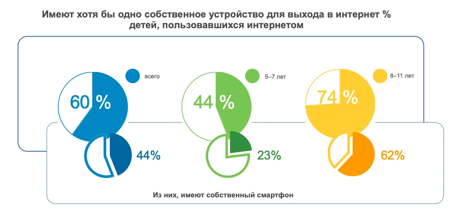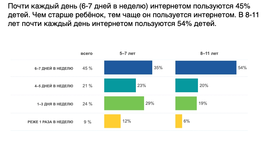 Согласно статистическим данным, в 5−7 лет ребенок проводит в Сети около 39% своего времени. Взрослея, он начинает уделять интернету всё больше и больше внимания. К 8−11 годам данный показатель возрастает до 55%, говорится в докладе «Детский Рунет», подготовленном «Лабораторией Касперского».