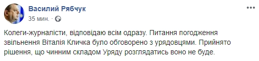 Коллеги-журналисты, отвечаю всем сразу. Вопрос согласования увольнения Виталия Кличко обсудили с чиновниками. Принято решение, что действующим составом правительства оно рассматриваться не будет, — написал пресс-секретарь в соцсети.