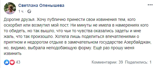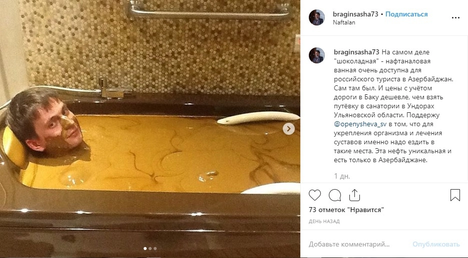 Напомним, Опенышева опубликовала в Instagram фотографии, сделанные в лечебной ванне в санатории в Азербайджане. На снимке чиновница принимает ванну с нафталанской нефтью, комментируя это так: «Много шоколада не бывает».