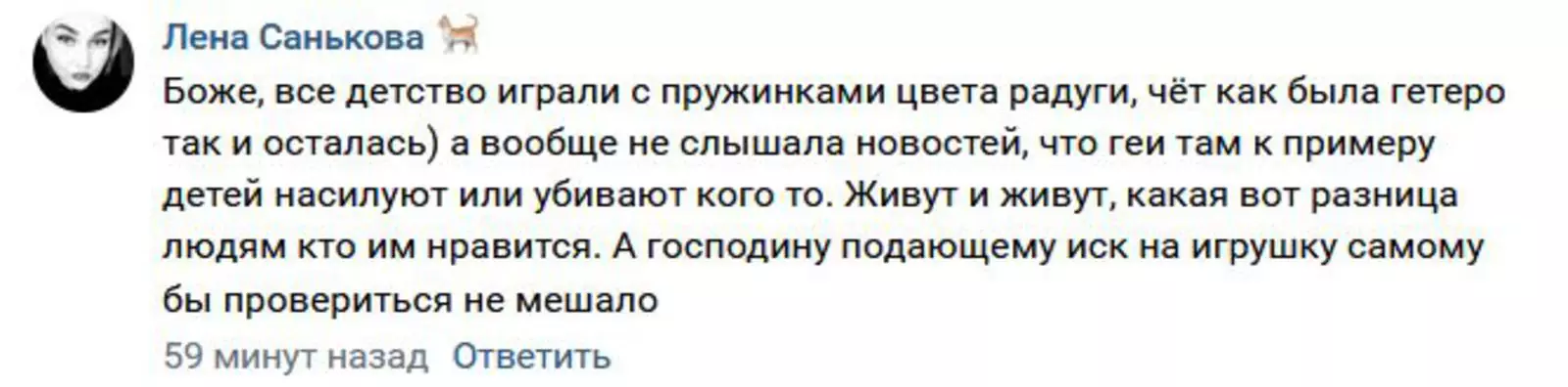 Еще один человек вспомнил про пружинки, окрашенные в цвета радуги, с которыми играли дети в 1990-х годах, но геями не стали, а так и остались гетеро.