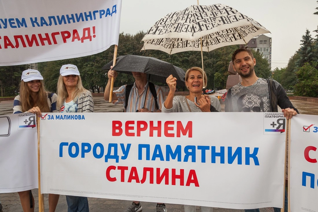 Лидер регионального калининградского отделения партии «Гражданская платформа» Сергей Маликов, который баллотируется в нижнюю палату по 98-му одномандатному округу, устроил в Калининграде предвыборный митинг. Сторонники кандидата вышли на улицы, призывая вернуть в город памятник Иосифу Сталину, а всех коррупционеров отправить в ГУЛАГ.