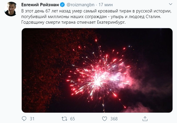 Бывший глава Екатеринбурга Евгений Ройзман тоже однозначно поддержал инициативу празднования смерти Сталина.