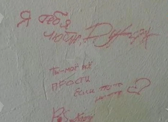 На стене красным цветом написано «Я тебя люблю» и «Ты мое все, прости если что не так».