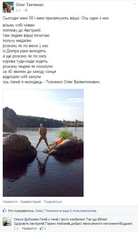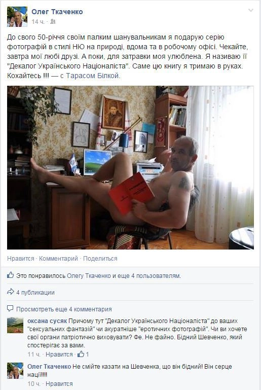 Один из самых скандальных политических деятелей Запорожья — Олег Ткаченко — уже не заставляет жителей края сомневаться в своей нормальности. Очевидно она давно уже испарилась. Ярый майданщик, глава Запорожского областного объединения Общества «Просвита», выложил в одну из соцсетей свои фотографии в голом виде, сопроводив их странными надписями.