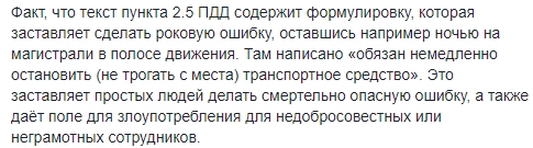 Есть п. 2.6.1, согласно которому вы можете запомнить обстоятельства ДТП, съехать на обочину и оформить ДТП схемой. Да, там есть слово „зафиксировать“… Раздел 16 ПДД однозначно запрещает остановку на магистралях и дорогах для автомобилей. И требует при вынужденной остановке (ДТП частный случай вынужденной остановки) — немедленно уйти с полосы движения на обочину, — цитирует Евсин.