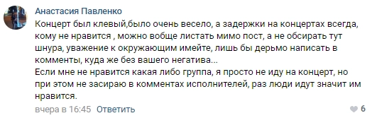 В целом зрители, попавшие на «Ростов-Арену», остались довольны выступлением Шнура и его фирменным стилем. Но ряд жителей Ростова оказался солидарен с Александрой Мирошниченко.
