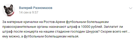Как сообщает Telegram-канал «112», ростовская полиция приняла заявление сотрудницы федерального ведомства об употреблении Шнуровым ненормативной лексики на прощальном концерте на «Ростов-Арене». Сейчас правоохранители собирают материал для возбуждения против певца административного дела.