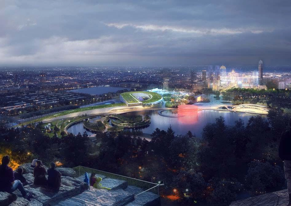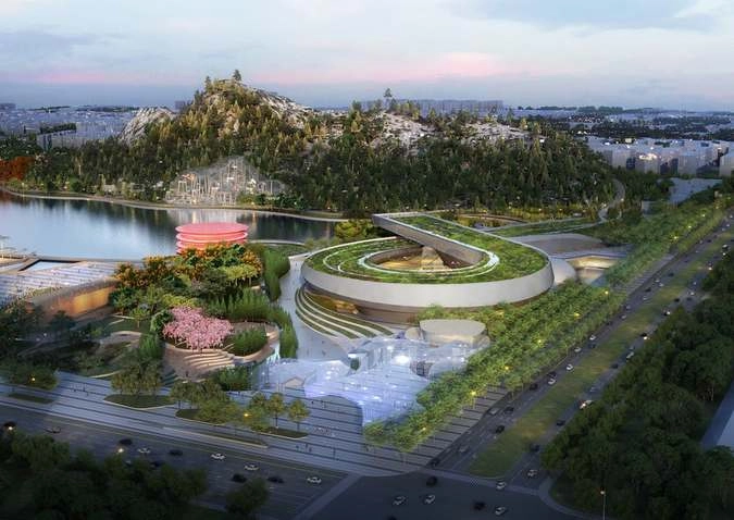 Согласно проекту, площадь здания — 55 741 кв. метр. Музей будет напрямую взаимодействовать с окружающим ландшафтом. Например, часть объектов расположена так, что создается эффект, будто музей «вырастает» из гор и завивается в ленту над озером и группой небольших искусственных островов.