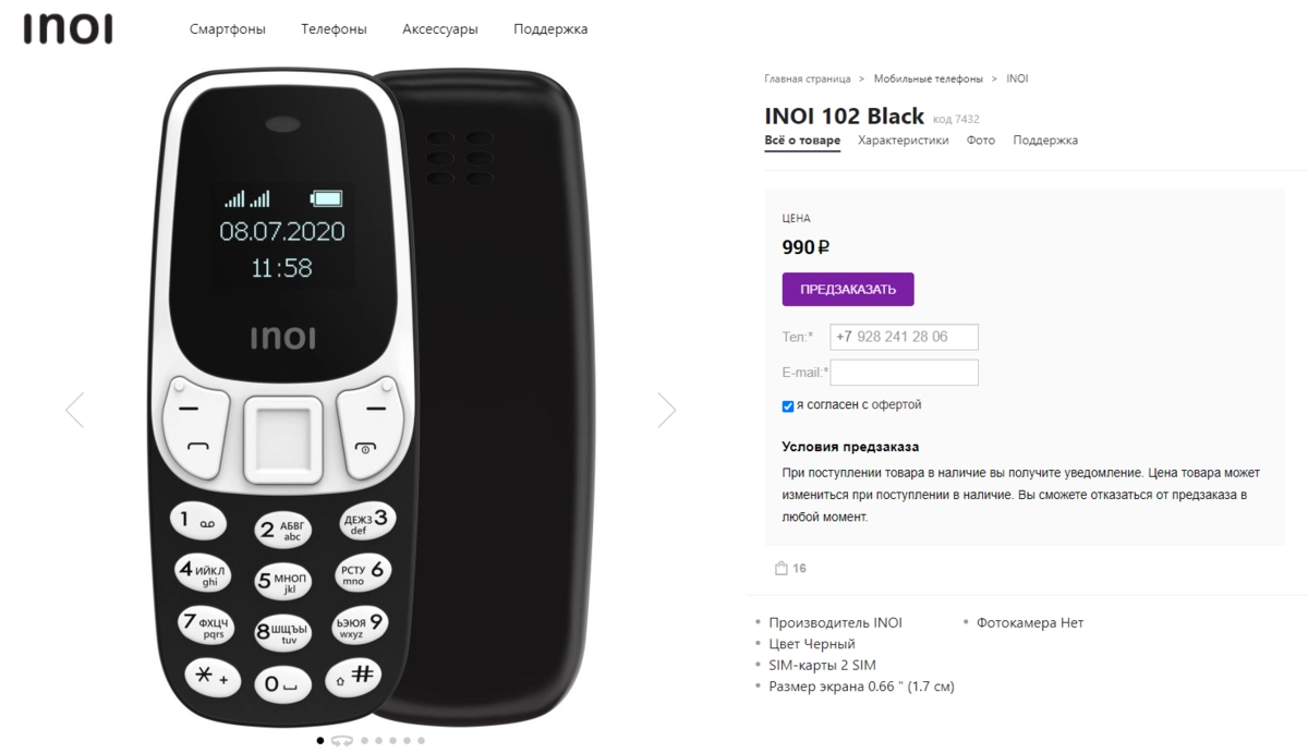 Как сообщает РИА «Новости», миниатюрный телефон уже доступен для предзаказа на официальном сайте компании Inoi. Стоимость одного экземпляра Inoi 102 соответствует его размерам и возможностям — 990 рублей.