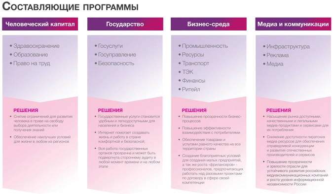Проанализировав аналогичные государственные программы стран Евросоюза и Азии, США и Канады, эксперты заложили в основу российской программы четырех базовых блока: «Человеческий капитал», «Государство», «Бизнес-среда», «Медиа и коммуникации».