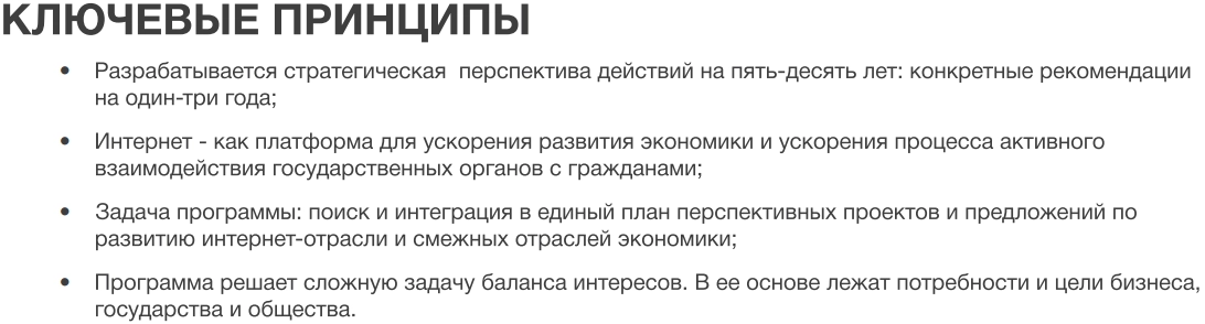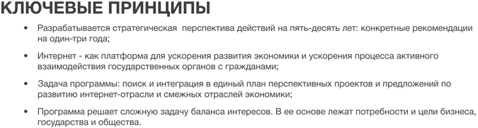 «Программой развития российского сегмента сети Интернет и связанных с ней отраслей экономики» эксперты ИРИ именуют комплексную платформу для развития разных направлений. Говоря словами ведущего эксперта Института Федора Вирина, разрабатываемая программа — «не про Интернет, а про экономику, про то, как в экономике использовать Интернет».