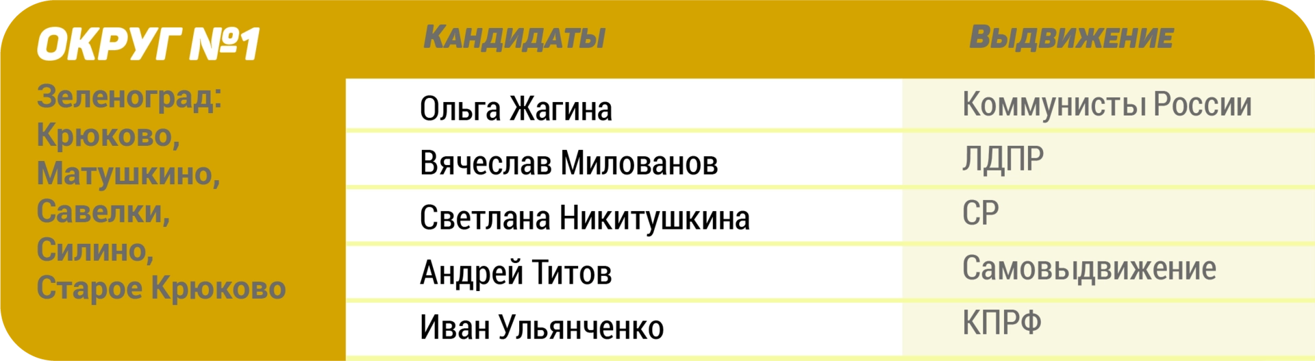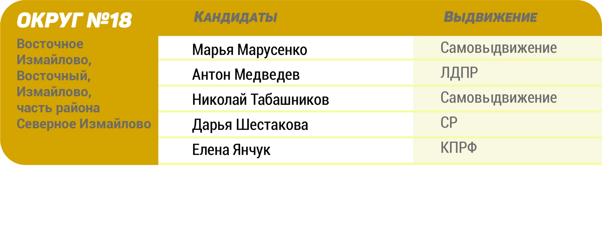 Не участвуют в выборах самовыдвиженцы Марина Лукьянец, Игорь Томилин и Андрей Черный, а также Евгения Гершберг («Яблоко»).