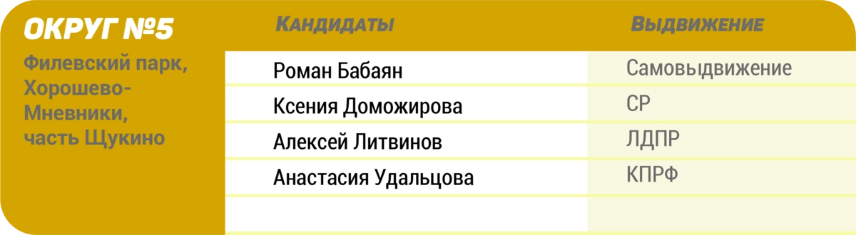 Имена кандидатов в пятом округе знакомы многим. Экс-парламентарий Дмитрий Гудков вел заметную агитационную работу, но брака в его подписных листах оказалось намного больше допустимых 10%. «Пранкер Вован» (Кузнецов) оказался куда популярнее в Сети, чем в оффлайне: он не смог собрать необходимого количества подписей и, судя по агитационной кампании, едва ли пытался. Двум другим знаменитостям удалось попасть в бюллетень: регистрацию получила супруга активиста Сергея Удальцова Анастасия и ведущий программы «Право голоса» на ТВЦ Роман Бабаян.