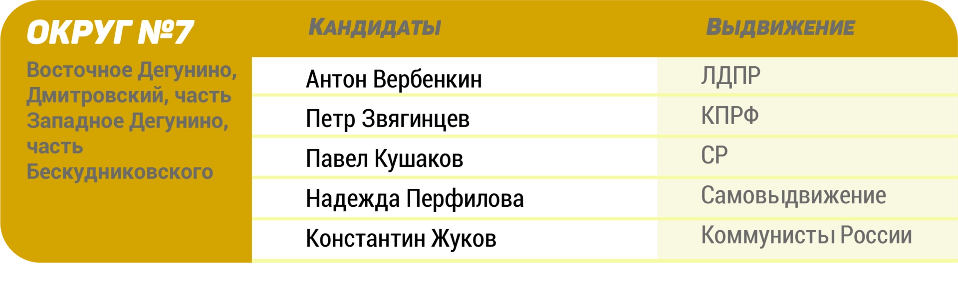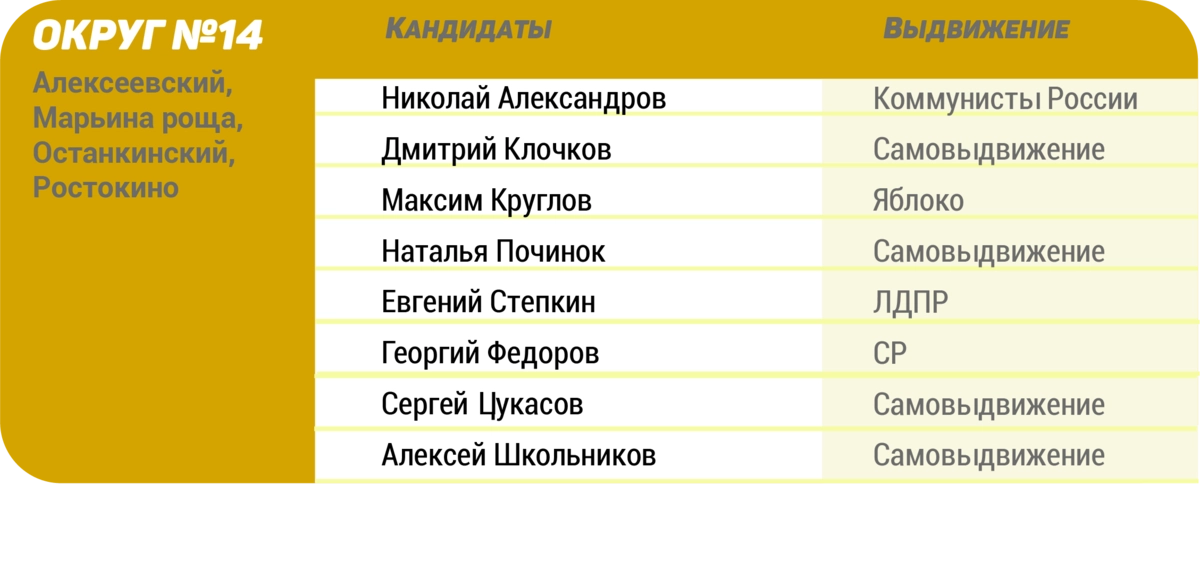 Пролетели мимо выборов Михаил Корнеев («Национальный курс»), Виктор Хамраев («Яблоко»), Наталья Янкова («Родина»). Местный фаворит — директор парка «Бабушкинский» Игорь Бускин, который решил победить на выборах, используя личный бренд, а не символику «Единой России».