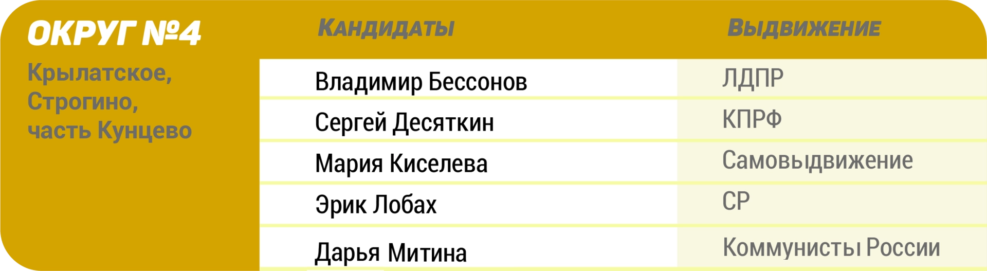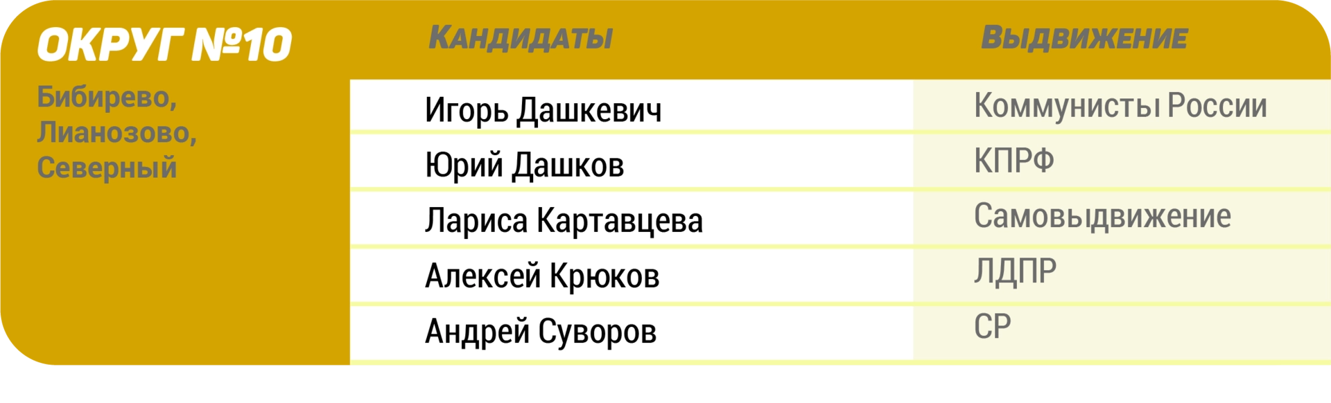 В десятом округе не получил регистрацию только родинец Дмитрий Касьмин. Фаворитом гонки в округе называют действующего депутата Мосгордумы Ларису Картавцеву, которая, судя по всему, не намерена возвращать свой мандат без боя. В округе пройдет эксперимент по электронному голосованию.