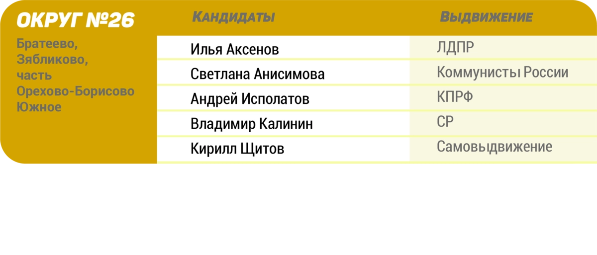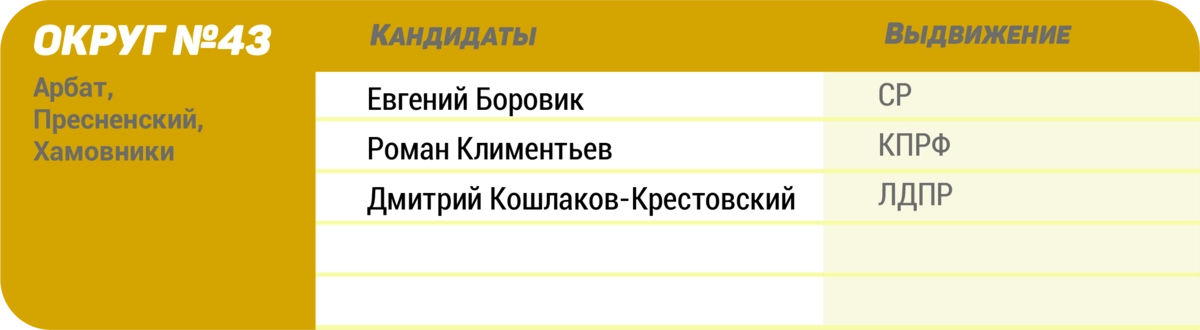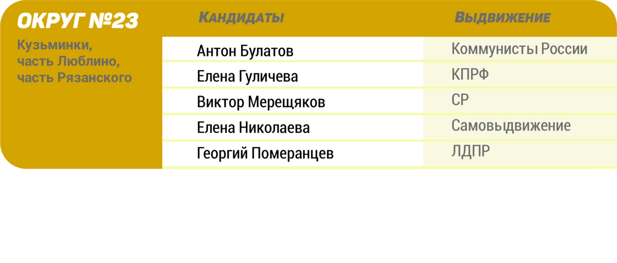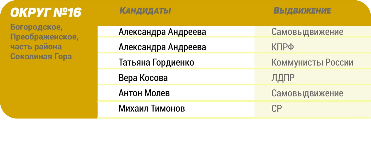 Теперь взгляните на наши карточки — они покажут список кандидатов в вашем округе на основе данных Мосгоризбиркома. Рядом — информация о кандидатах, пролетевших мимо выборов, а также главные скандалы политической гонки.